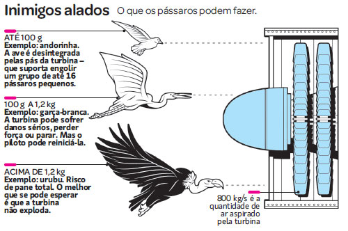O maior inimigo das turbinas não são as falhas mecânicas; são os pássaros. Entre 1990 e 2007, houve mais de 12 mil colisões entre aves e aviões. As turbinas são projetadas para suportar alguns tipos de pássaro (veja abaixo), e isso é testado em laboratório com uma máquina, o “canhão de galinhas”, que dispara frangos mortos contra as turbinas a 400 km/h. Desde 1990, 312 turbinas foram completamente destruídas em voo pelos pássaros. Se o avião perder um dos motores, consegue voar só com o outro. Mas, se isso acontecer durante a decolagem, quando a aeronave está baixa e lenta (90% dessas colisões acontecem a menos de 1 000 metros de altitude), ou se os pássaros destruírem ambas as turbinas, as consequências podem ser dramáticas. Como no incrível caso de um Airbus A320 da US Airways que perdeu os dois motores logo após decolar de Nova York, em janeiro de 2009. Mesmo sem nenhuma propulsão, o piloto conseguiu voar mais 6 minutos e levar o avião até o rio Hudson. Num dos raríssimos casos de pouso bem-sucedido na água, ninguém morreu.