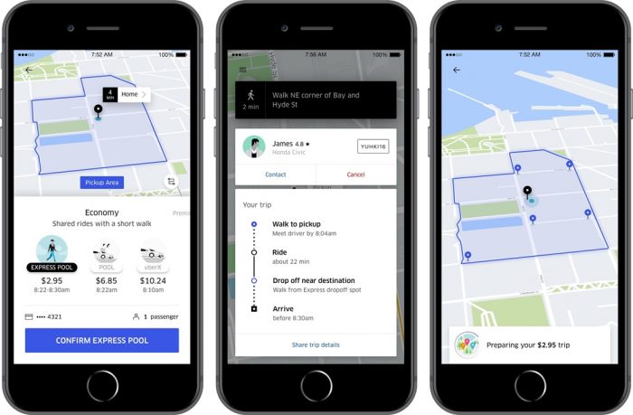É quase como ir para o ponto de ônibus mais próximo, só que o local de embarque é definido dinamicamente: o serviço checa quais usuários irão para a mesma região, verifica se eles estão geograficamente próximos e então pede para que eles caminhem até um ponto de encontro. O carro do Uber Express Pool que prestará o serviço estará lá.