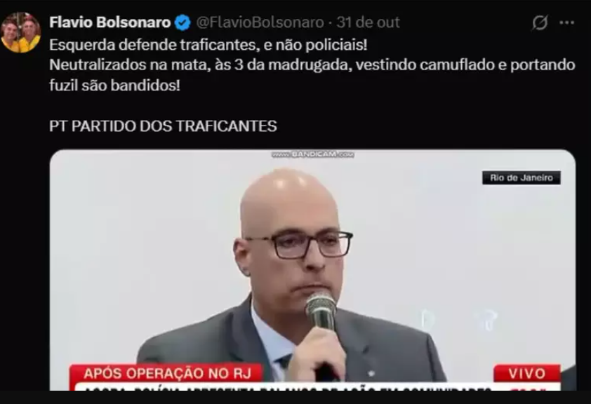 Justiça derruba suspensão do post de Flávio Bolsonaro sobre “Partidos dos Traficantes”