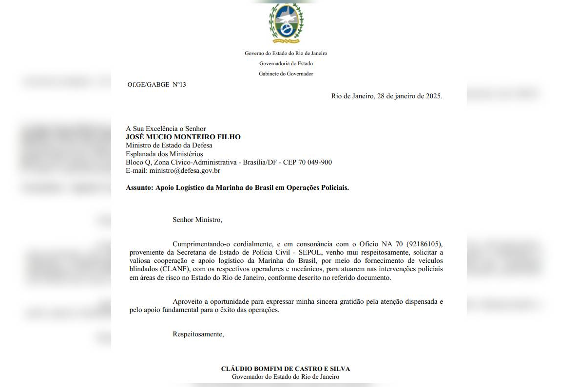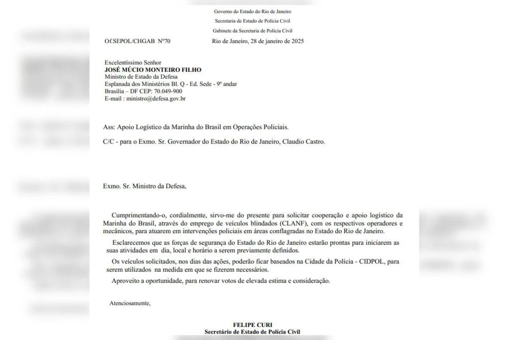 Documentos oficiais confirmam que o Governo do Rio de Janeiro solicitou apoio das Forças Armadas em janeiro de 2025, pedindo veículos blindados e suporte técnico da Marinha para operações policiais em áreas de risco. Os ofícios foram encaminhados ao Ministério da Defesa, com o objetivo de reforçar a atuação das forças estaduais em comunidades dominadas por facções criminosas.